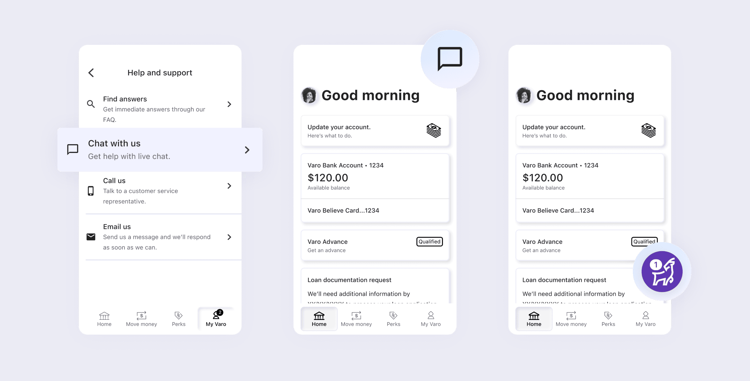 If they have received a message from a representative, badging will be displayed to inform them of the correspondence, as well as guide them back to Varo chat.