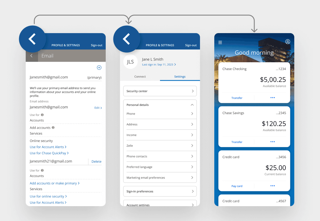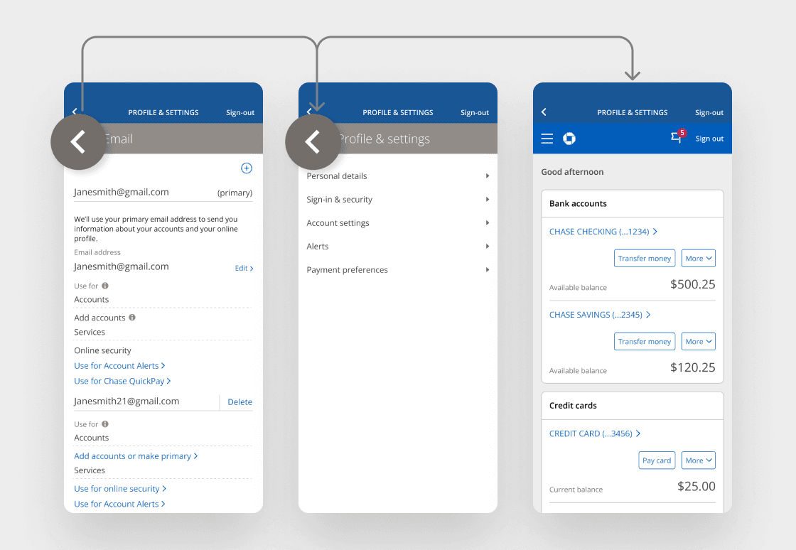 Framed Chase online experiences presented potential challenges. Specifically, web pages had a unique method of going back or closing out, known as the modal header. Framing this modal header would lead to redundancy with the native header. If a customer tapped the back arrow on the web modal header, they would navigate to web experiences instead of the native ones.