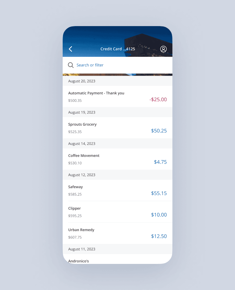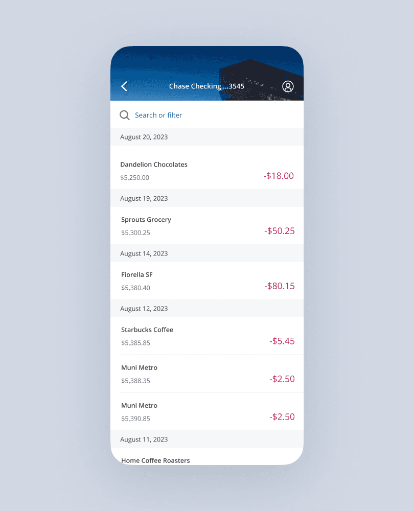 Transaction history provides a clear and organized list of transactions, including current, available, and running balances. It provides detailed transaction amounts, dates, and seamless search and filtering capabilities.