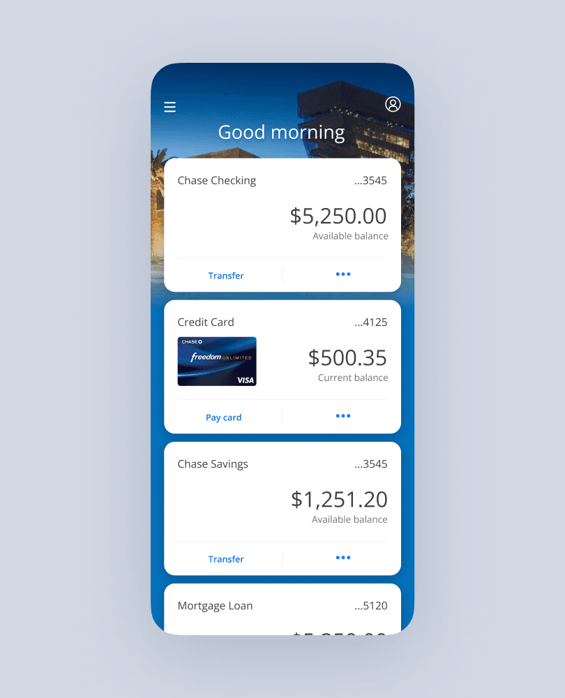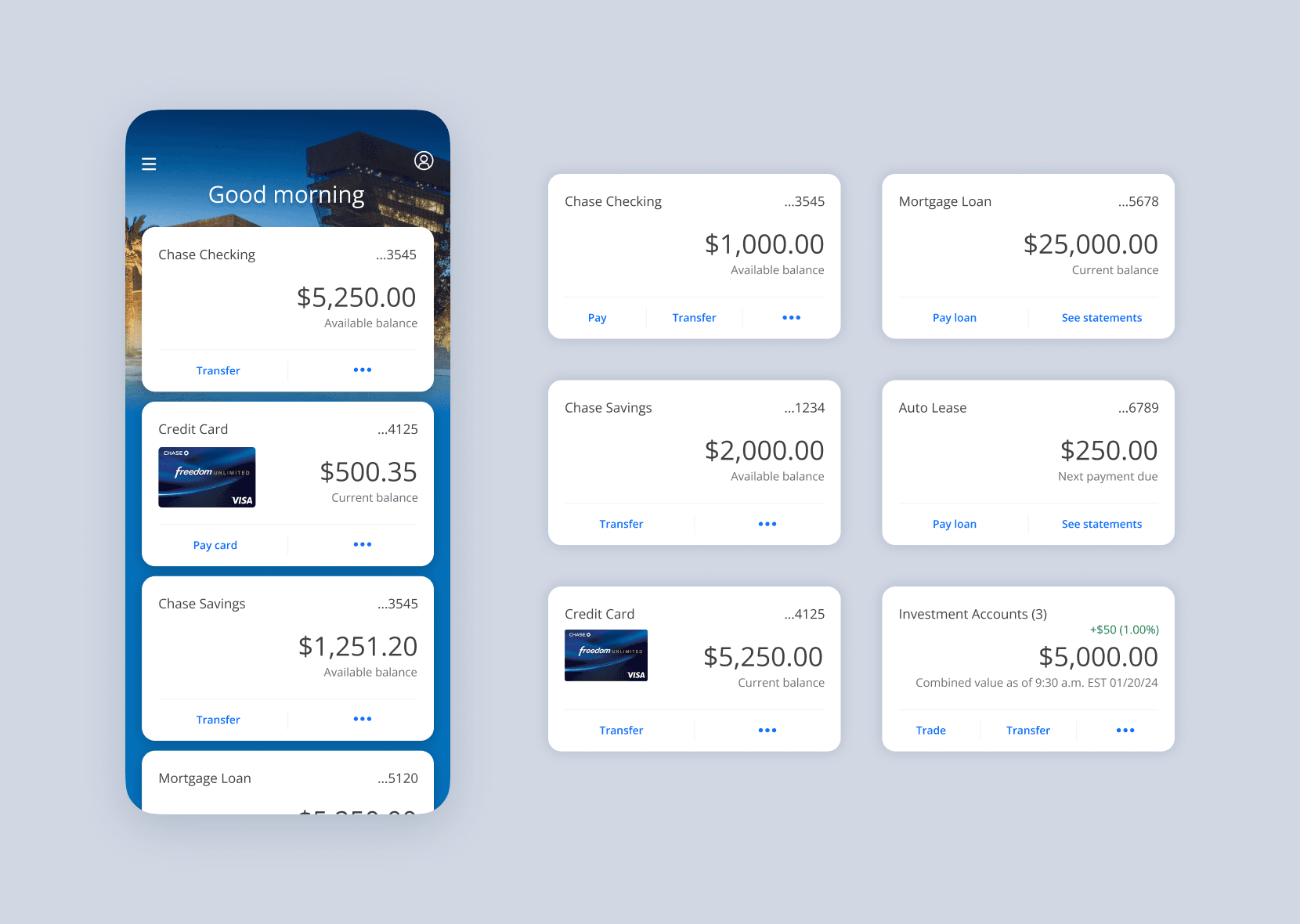The card content structure assures that, at a glance, customers can quickly identify all of their accounts, and get high-level insights on the financial status of each.