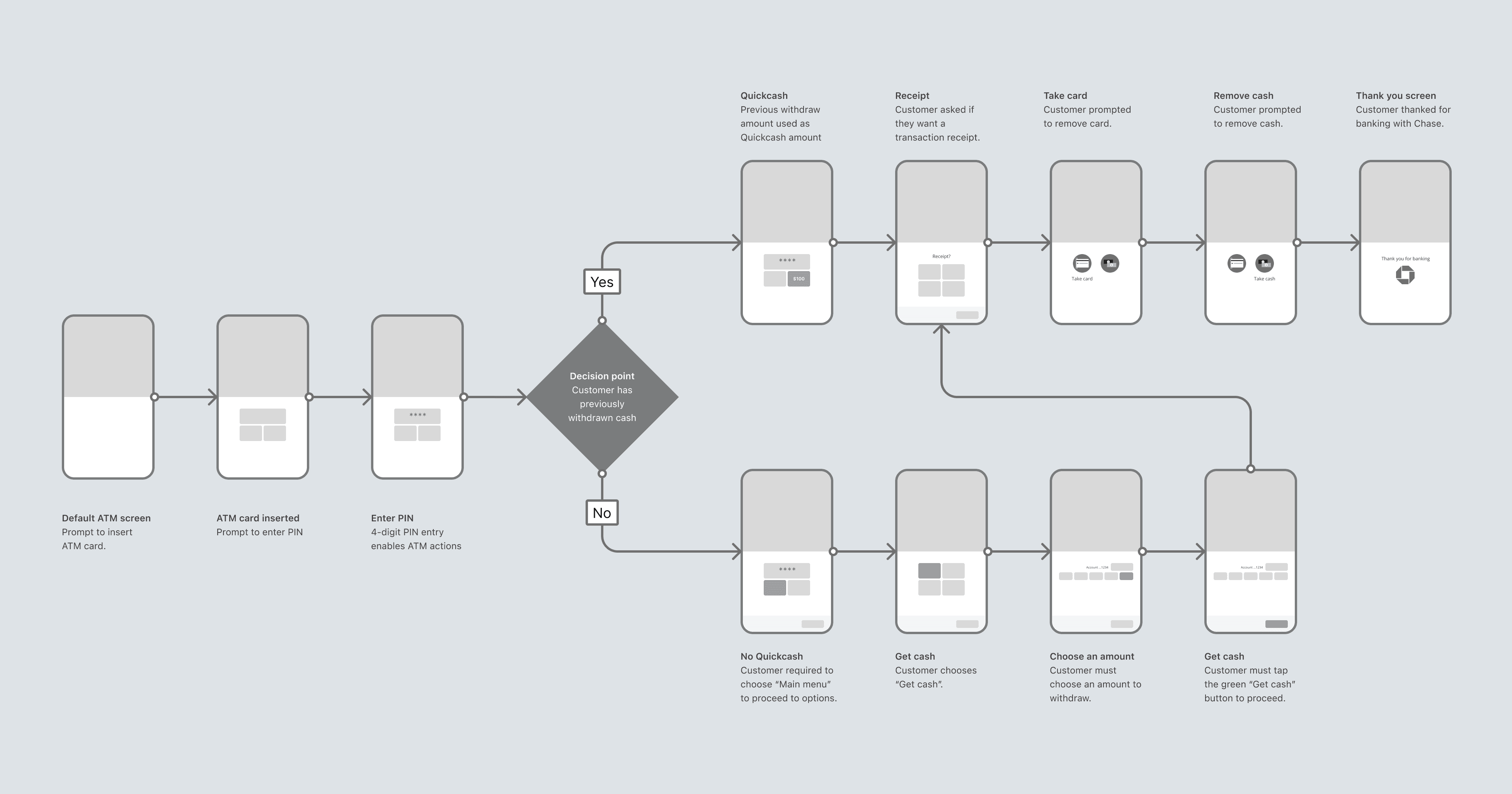 The Chase ATM experience had been the responsibility of an isolated team outside of the digital organization. I was personally asked by the head of our digital organization to act as a liaison to foster team building, and leverage the ATM team’s institutional knowledge and expertise to quickly align the ATM experience to our digital design language and system.