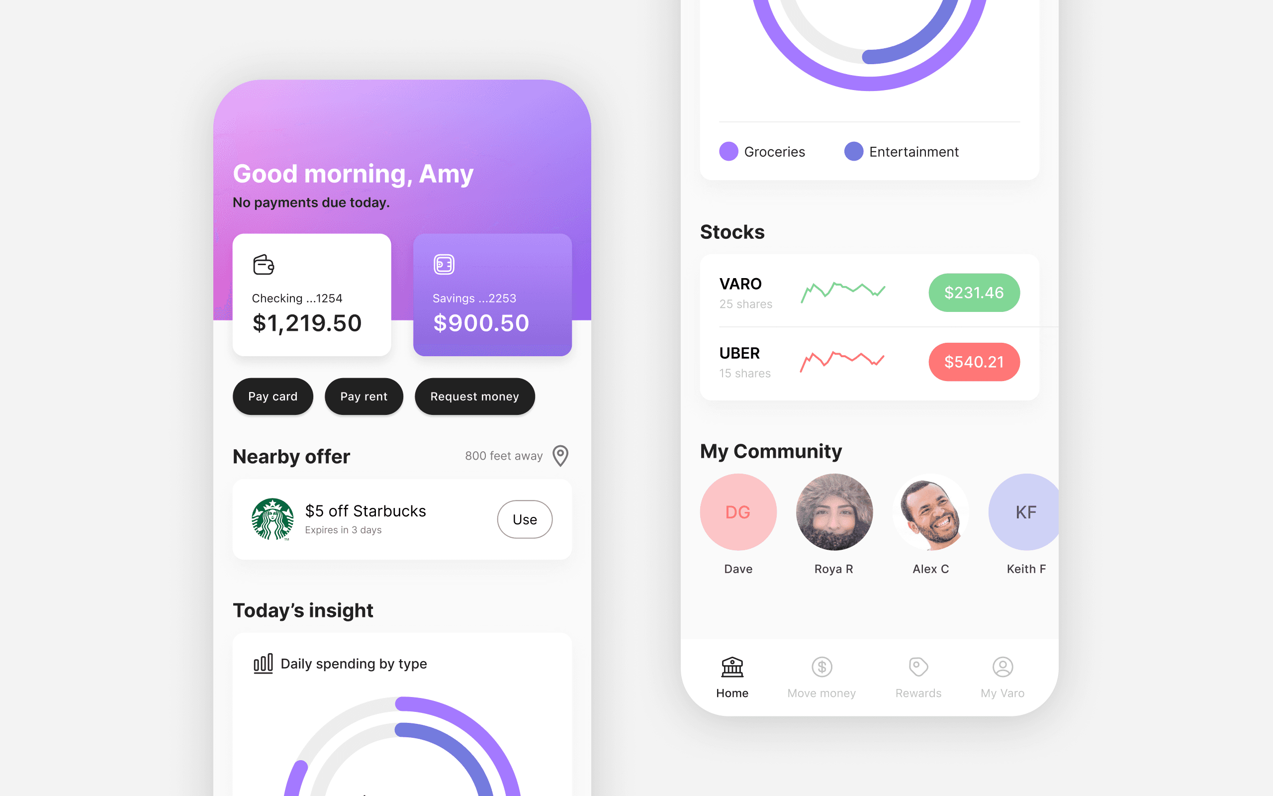 A few months into my time there, the head of product design pulled me into a meeting to share news about a rebranding effort Varo's marketing team was spearheading. A large part of the rebrand effort was to update the app and feel beyond the standard Google Material solutions Varo currently used for components, typography, and interactions to better reflect emerging design trends and the lives of our diverse customer base. At this point, designs had preliminary approval and the marketing team had engineering slated to start building in two weeks.
