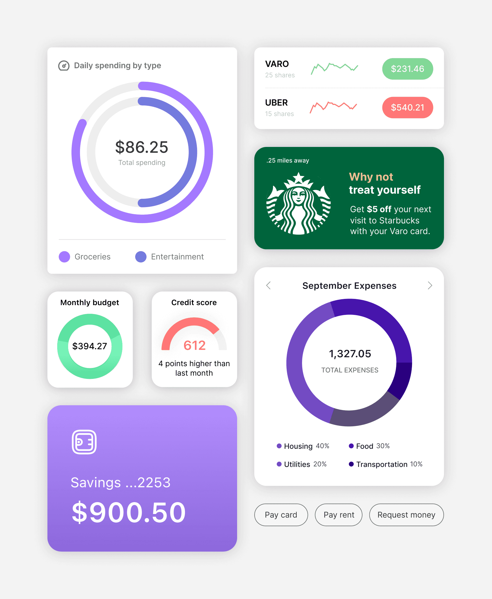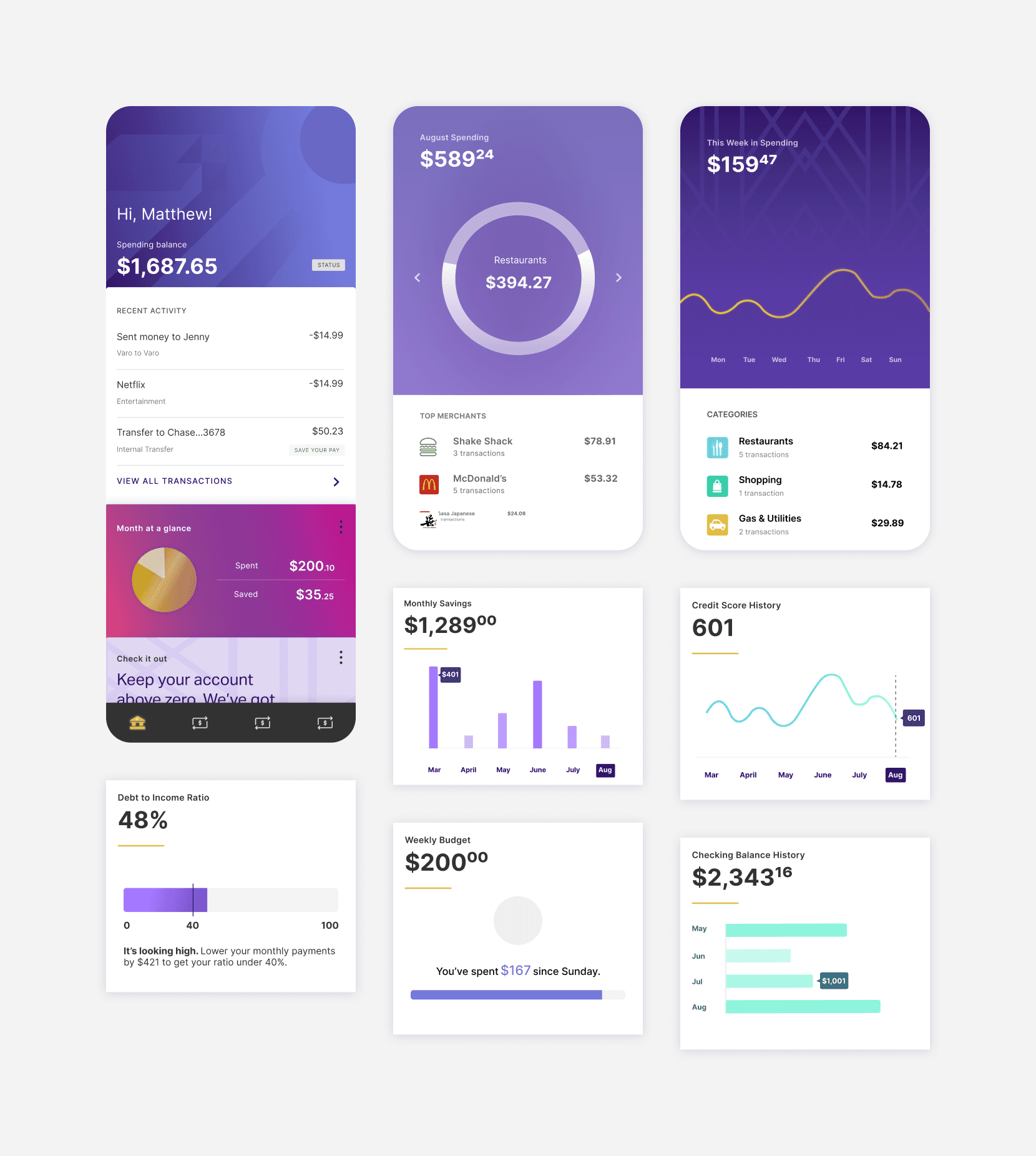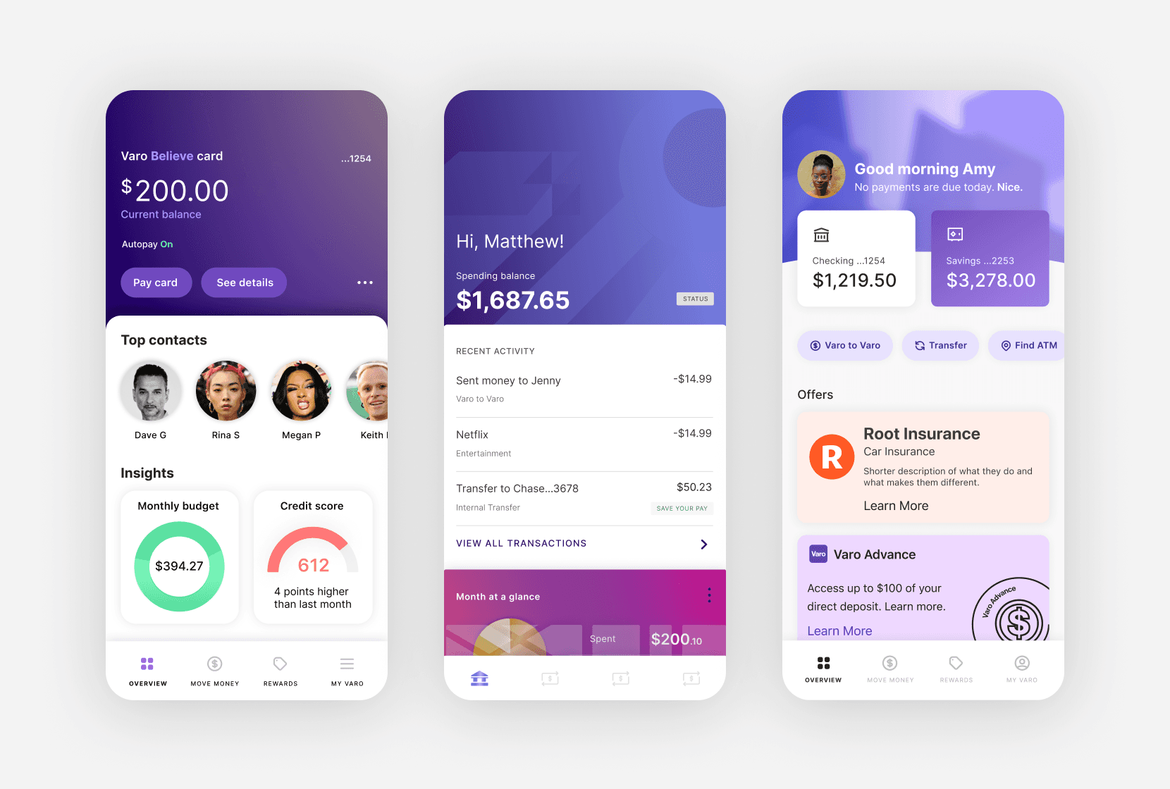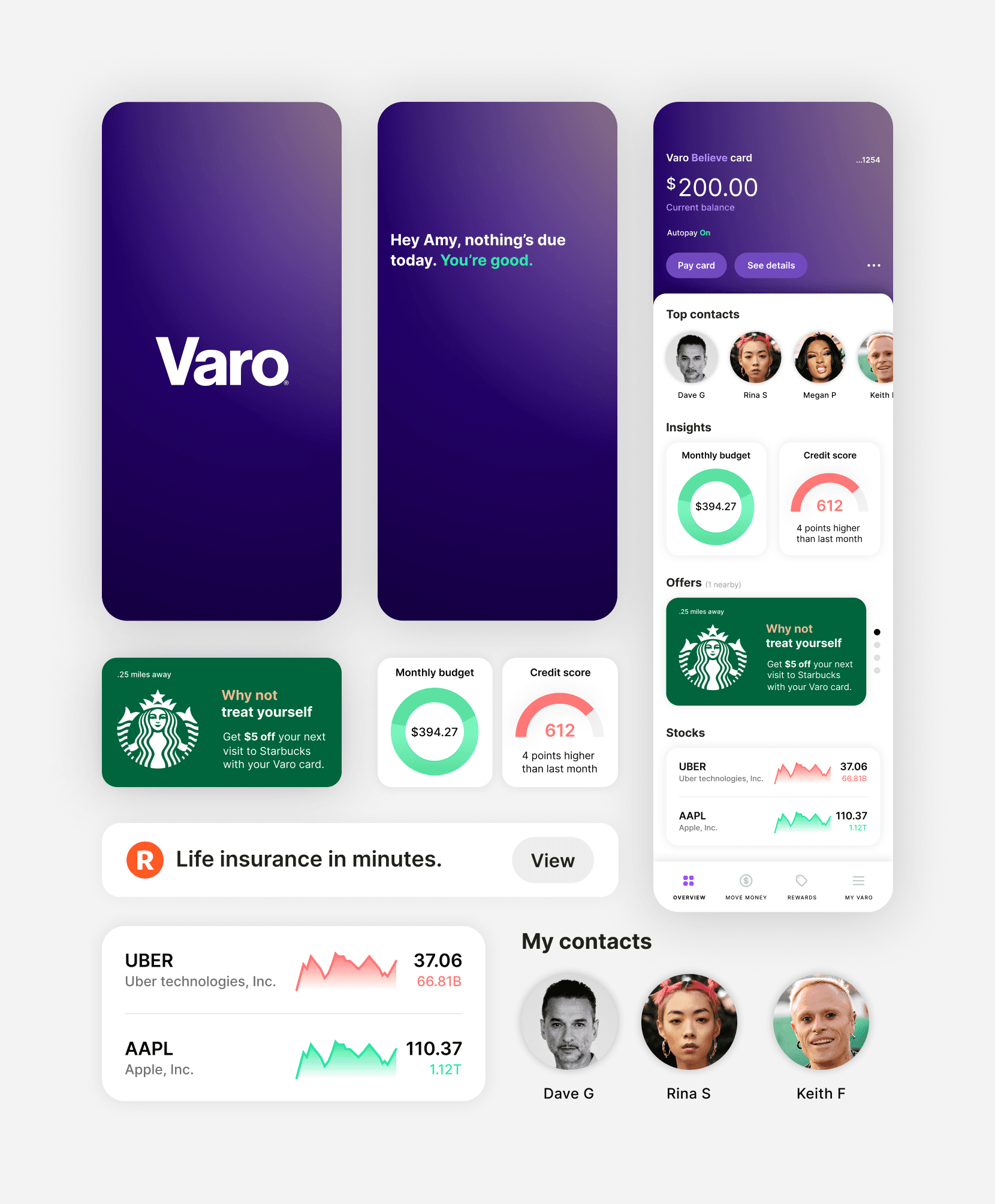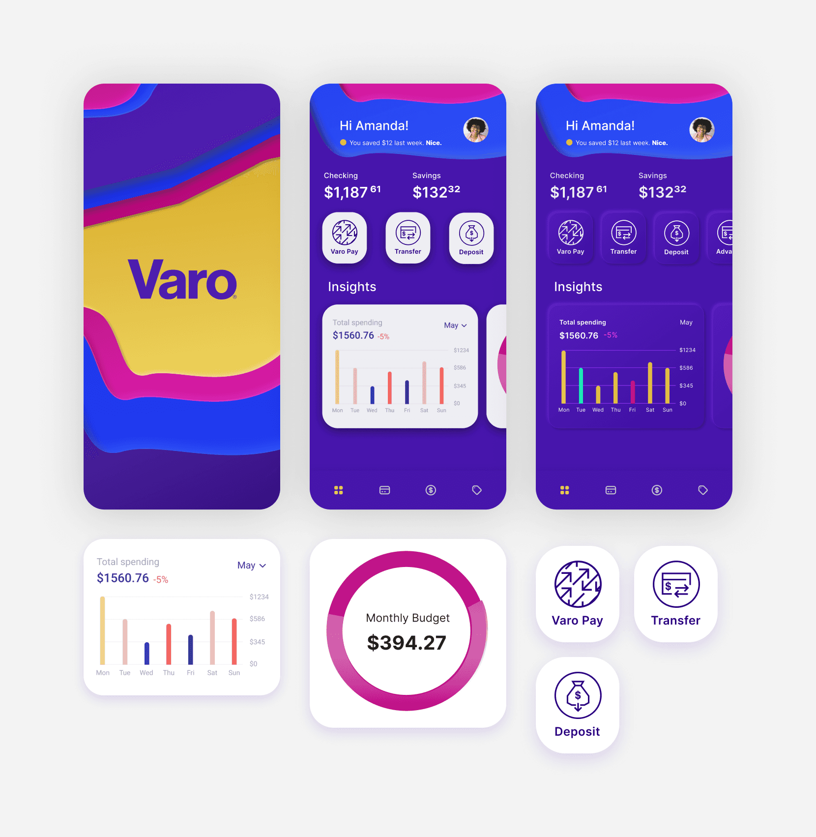 The Varo marketing team produced a new design language influenced by skeuomorphic trends and confident, bold typography. The team also proposed new customer services, such as choosing custom colors and avatars to further customize their banking experience.
