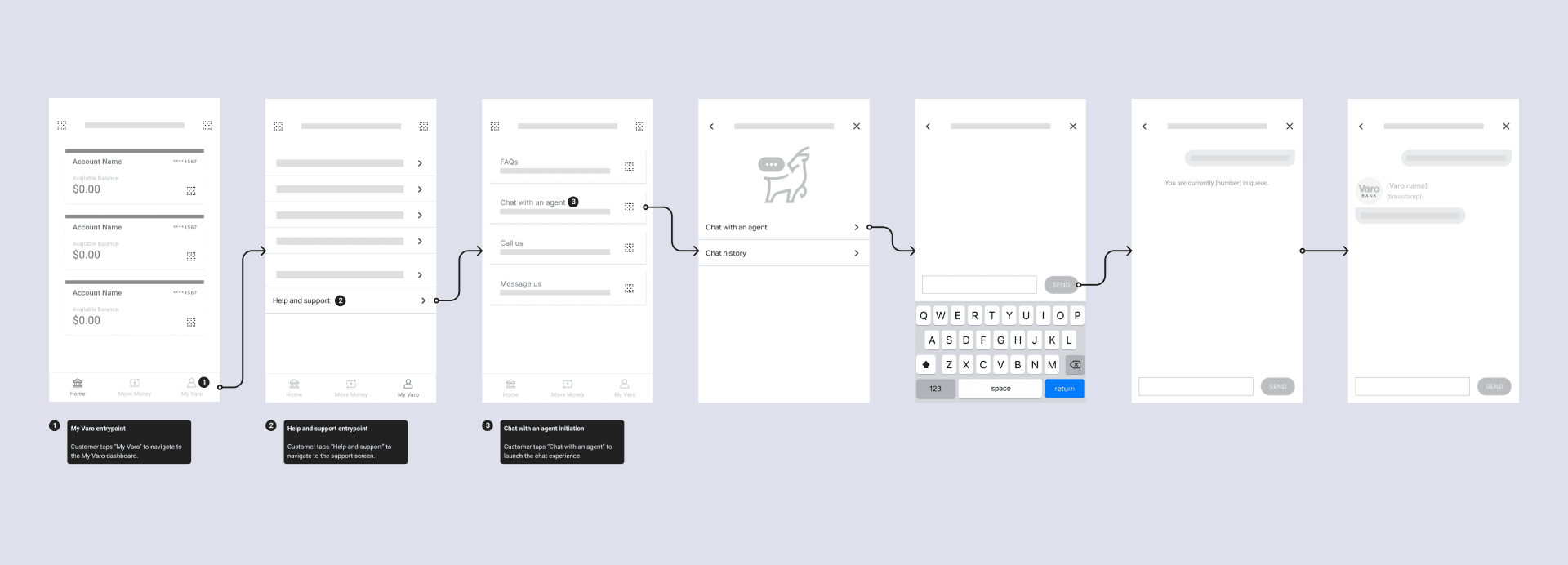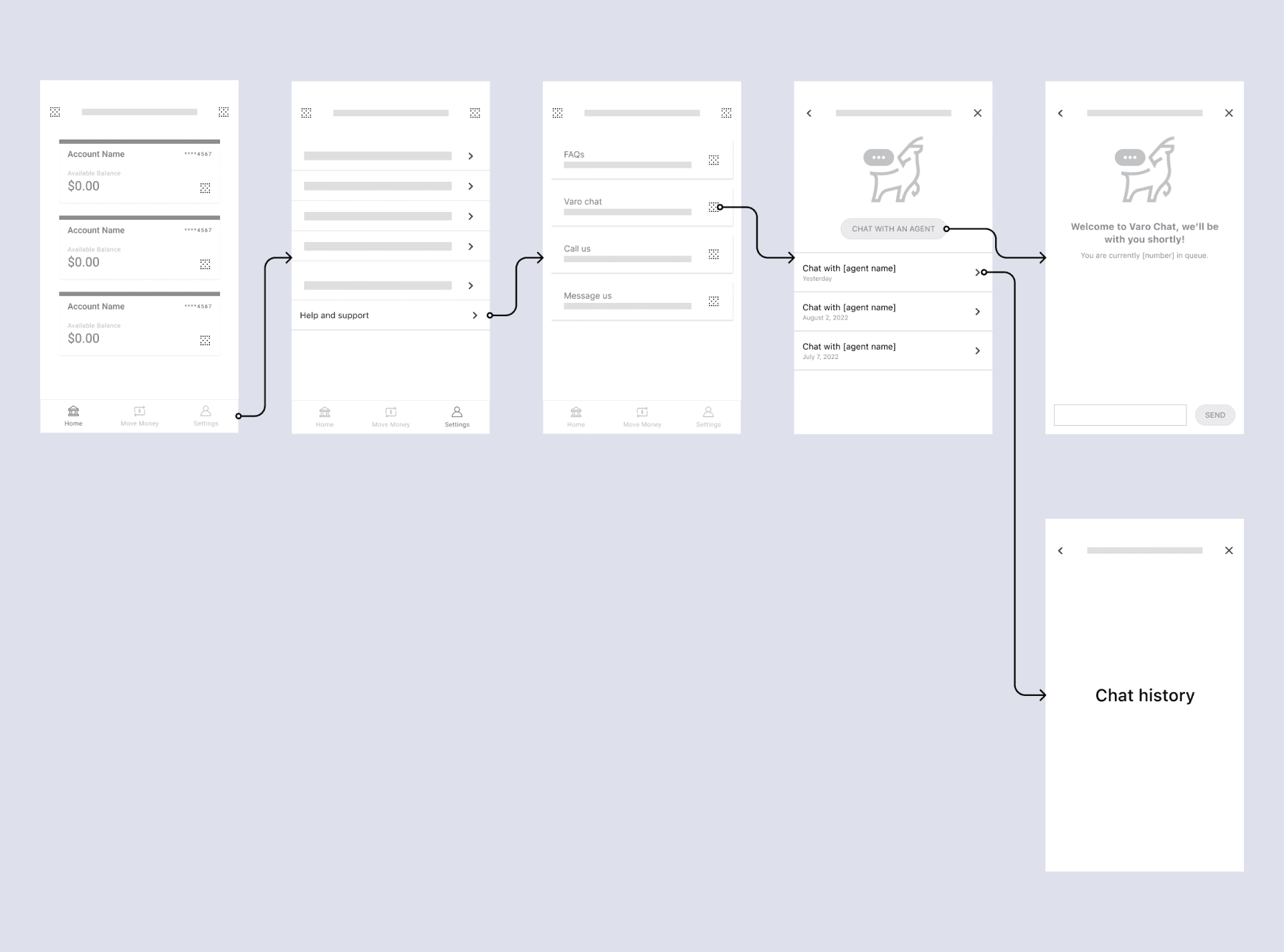 While ramping up on Varo's existing app and web experiences, my UX audit identified a few key servicing opportunities. Two glaring shortcomings were that online self-service was almost non-existent and that customers had to call Varo support — and then wait in long queues — for even the smallest of issues.