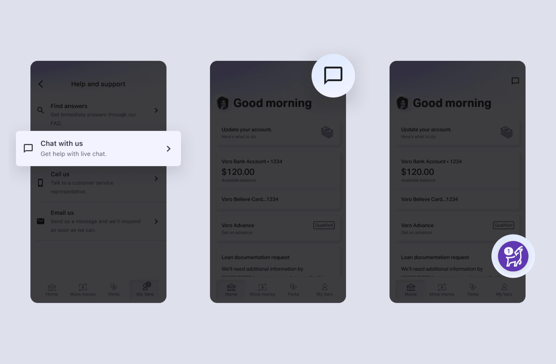 As I ideated potential solutions, I wanted to ensure the Varo Chat experience was always available where you need, easily identifiable as a chat platform, and that it is easy to know when Varo has reached out.
